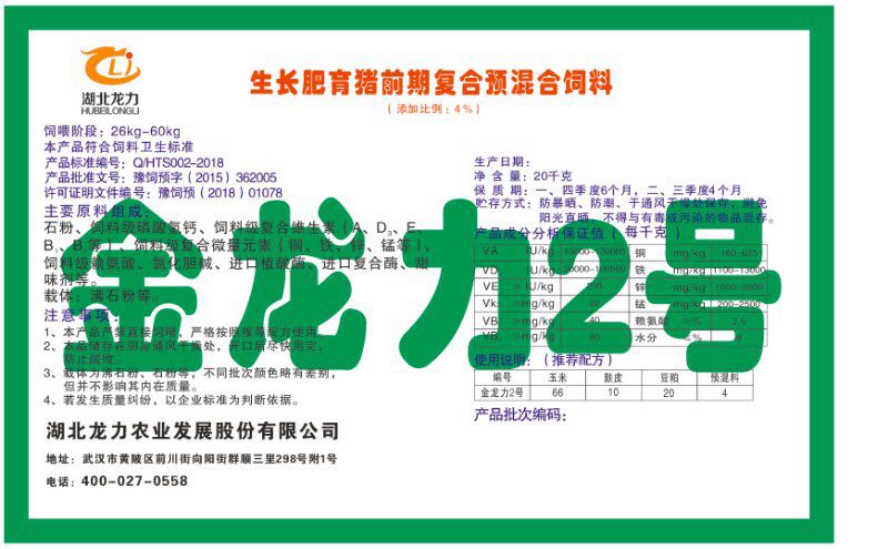 湖北龍力農(nóng)業(yè)發(fā)展股份有限公司坐落于武漢市黃陂區(qū)前川街向陽街群順三里298號附1號。公司成立于2014年6月,公司自成立以來把“創(chuàng)全球最大養(yǎng)豬綜合服務”為企業(yè)愿景。致力于打造教保料品牌”作為公司發(fā)展的明確目標。公司一直致力于豬營養(yǎng)的研究和開發(fā),積極與國內(nèi)外高校和科研機構(gòu)合作,推廣養(yǎng)豬技術(shù)、動物營養(yǎng)新概念,向世界農(nóng)牧企業(yè)學習與合作。公司采用國內(nèi)先進的生產(chǎn)工藝,選擇高精度電子配料秤,高均勻度、無殘留混合機等先進設備....
